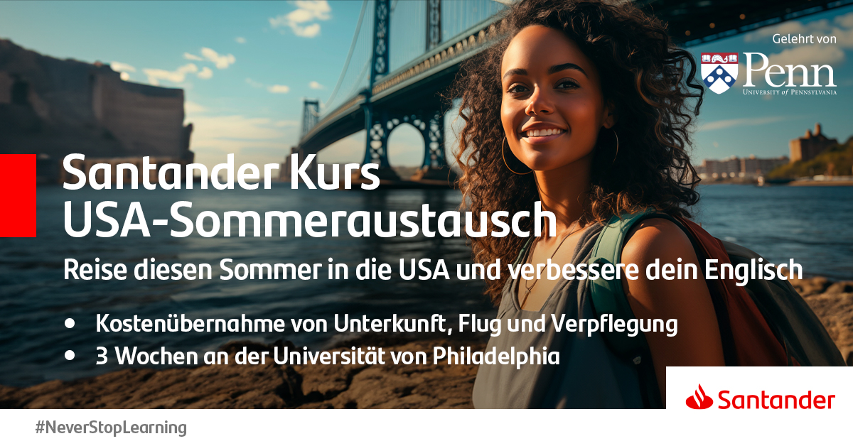 Santander bietet in Zusammenarbeit mit der University of Pennsylvania 90 Plätze für einen 3-wöchigen USA-Sommeraustausch an, bei dem sämtliche Kosten für Flug, Unterkunft und Mahlzeiten übernommen werden. Im Rahmen des Kurses nehmen die Teilnehmenden an verschiedenen Kursen teil.